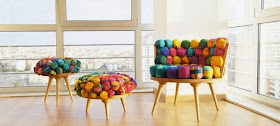 Its wooden structure is cushioned with sponge balls that’s are covered with colorful recycled silk yarn from Nepal. The use of recycled silk yarn is visually its most attractive ecological feature.